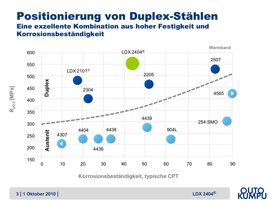 Duplex-Edelstahlgüten werden üblicherweise nach ihrem Legierungsgehalt und ihrer Korrosionsbeständigkeit in Lean-Duplex-, Standardduplex- und Superduplex-Stähle eingeteilt. Das neueste Mitglied dieser Familie, LDX 2404® von Outokumpu, weist dieselben Eigenschaften wie die Lean-Duplex-Güten auf, unterscheidet sich jedoch von allen anderen Duplex-Güten darin, dass er eine höhere Festigkeit bietet.